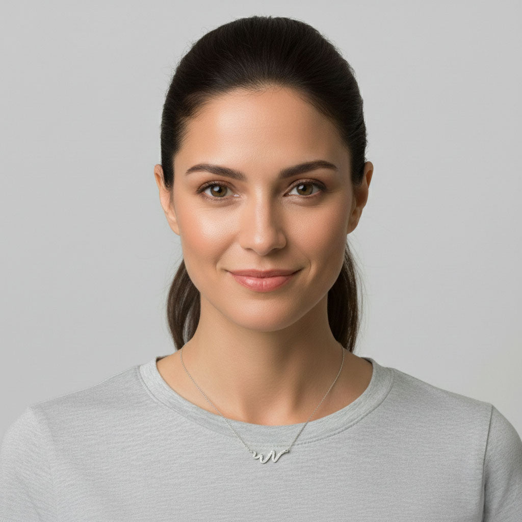 Kette mit einem wellenförmigen Anhänger, verziert mit kleinen schimmernden Steinen, die das Licht schön einfangen. Erhältlich in Silber oder Roségold – ein modernes Schmuckstück, das jedem Look einen besonderen Ausdruck gibt.