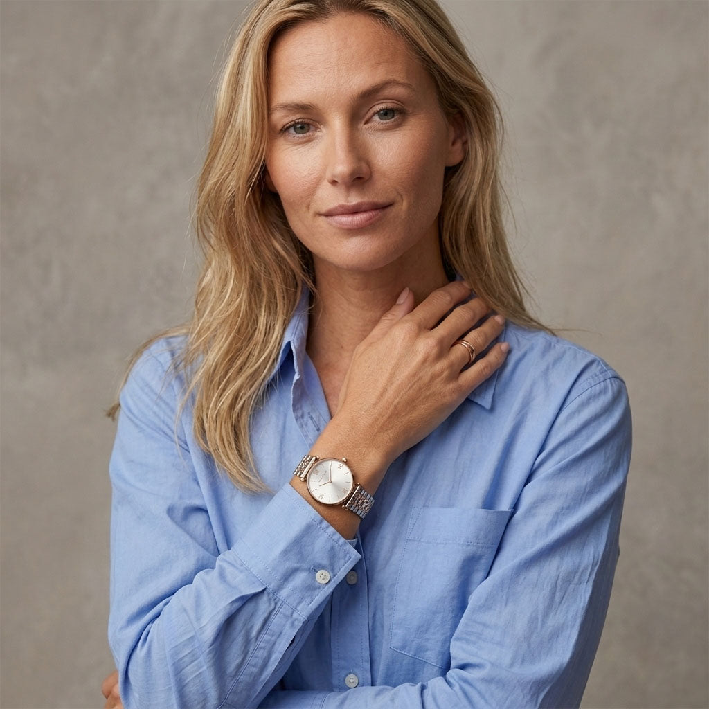 Diese Damenuhr wurde für die moderne Frau entworfen, die Stil und Funktion schätzt. Mit klassischem Zifferblatt und schlankem Edelstahlarmband vereint sie Mode und Praktikabilität. Wasserdicht und zuverlässig sitzt sie elegant am Handgelenk und begleitet Sie bei allen Abenteuern des Lebens.