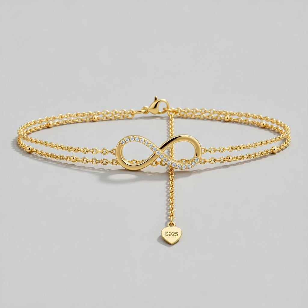 Doppelketten-Fußkettchen aus Sterlingsilber mit schimmernden Zirkonia und Unendlichkeitssymbol. Erhältlich in Silber oder Gold, ein leichtes Accessoire, das sommerlichen Looks eine frische Note verleiht.