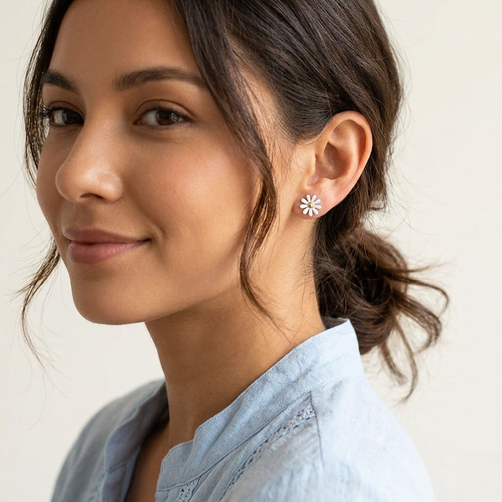 Ein Paar charmante Nieten mit Margeriten-Motiv, die einen frischen und sommerlichen Look verleihen. Perfekt, um Ihrem Look eine leichte, fröhliche Note zu verleihen.