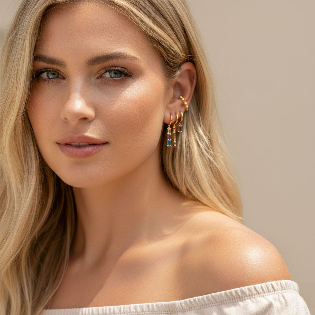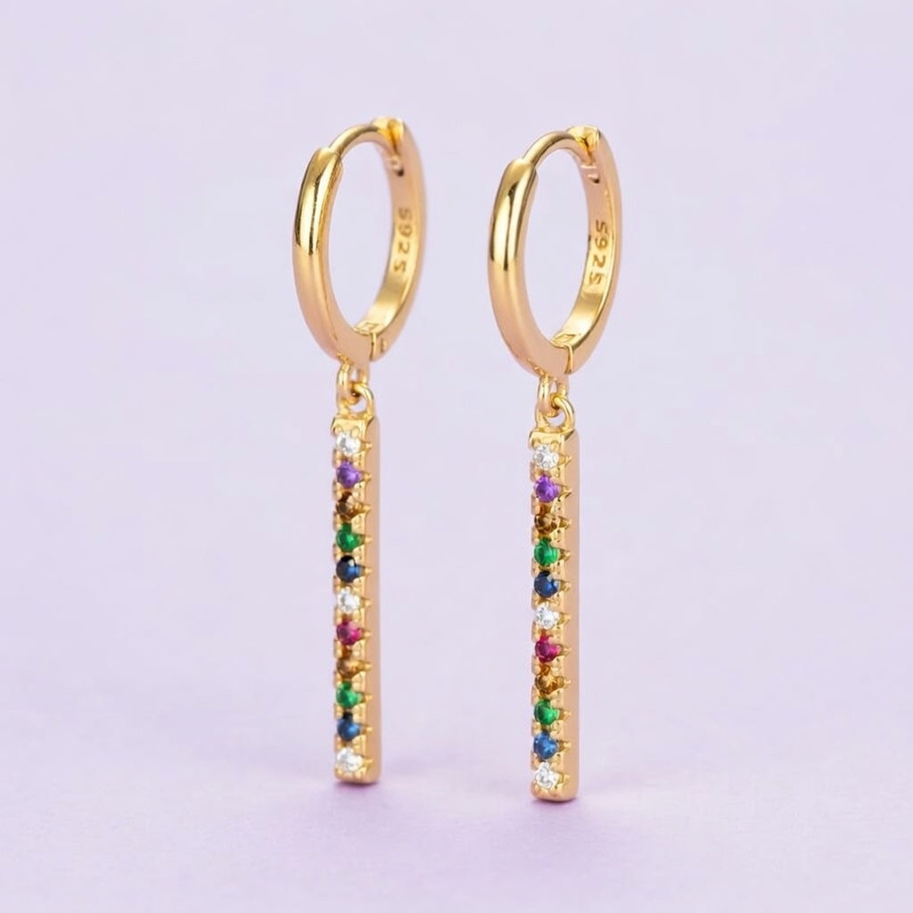 Verspielte Tassel-Ohrringe mit einem schmalen, hängenden Stab, verziert mit funkelnden Steinen in mehreren Farben. Das trendige Design bewegt sich schön und fängt das Licht ein, wodurch das Schmuckstück besonders lebendig wirkt. Erhältlich in Silber- und Goldfinish.