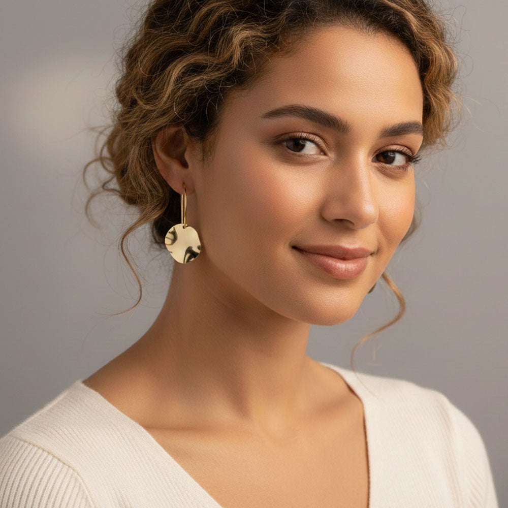 Stylische Creolen mit dekorativer Scheibe, erhältlich in Silber und Goldplattierung. Durch ihr schlichtes Design lassen sie sich leicht mit anderem Schmuck und verschiedenen Kleidungsstilen kombinieren.