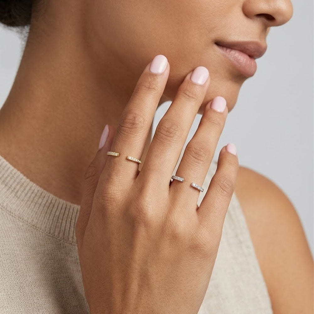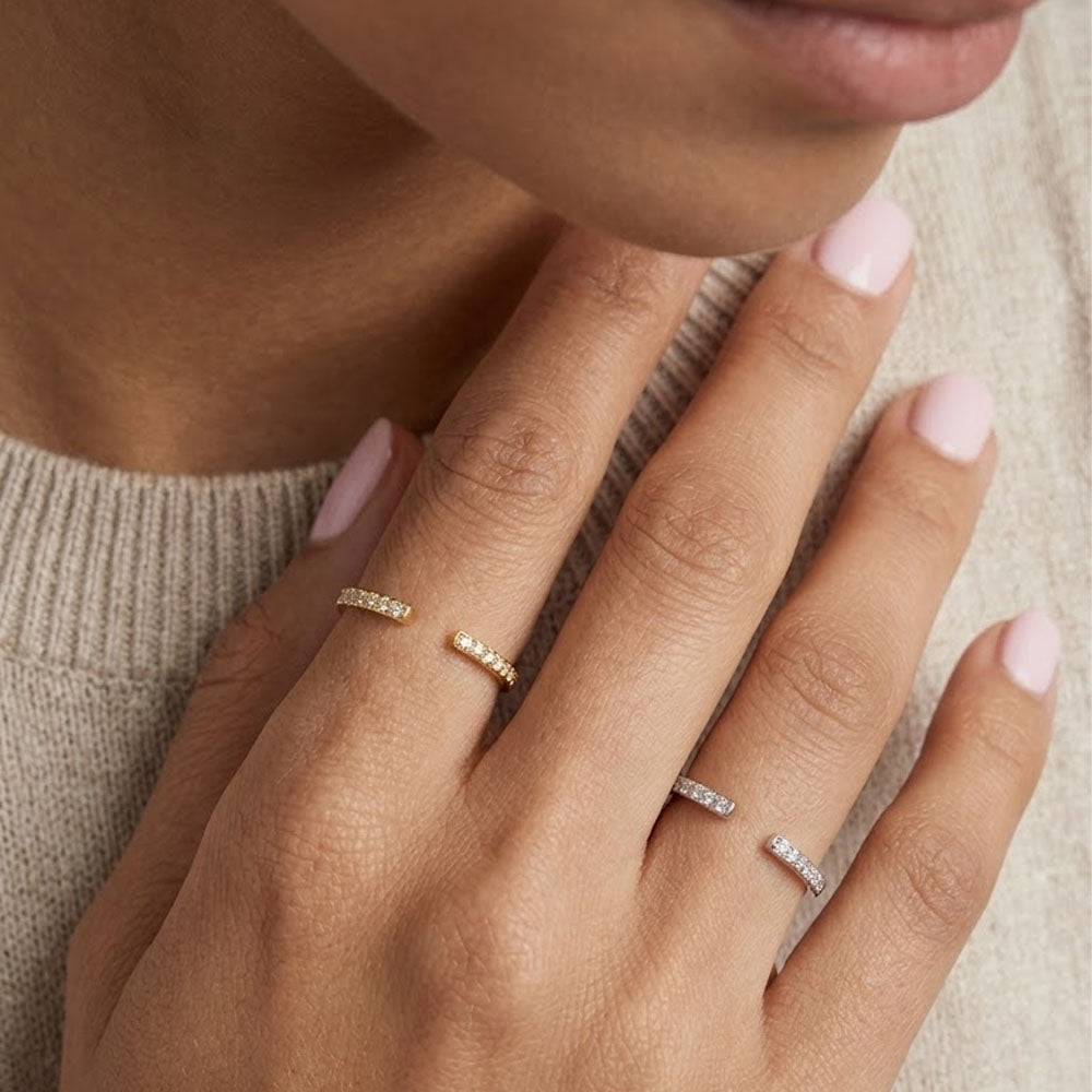 Ein schöner und zarter Ring aus Sterlingsilber, verziert mit funkelnden Zirkonen. Erhältlich in Silber und Goldplattierung und mit einer verstellbaren Öffnung, die den meisten passt. Wunderschön allein getragen oder in Kombination mit anderen Ringen.