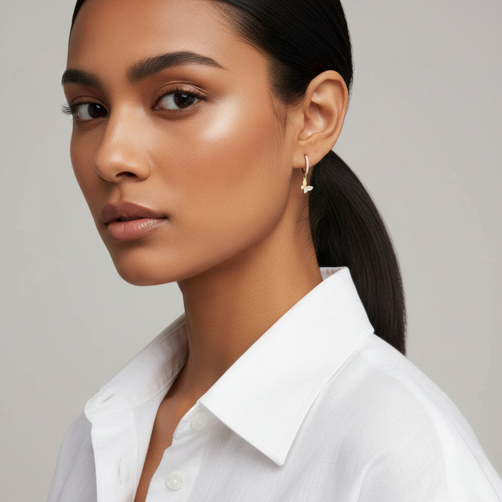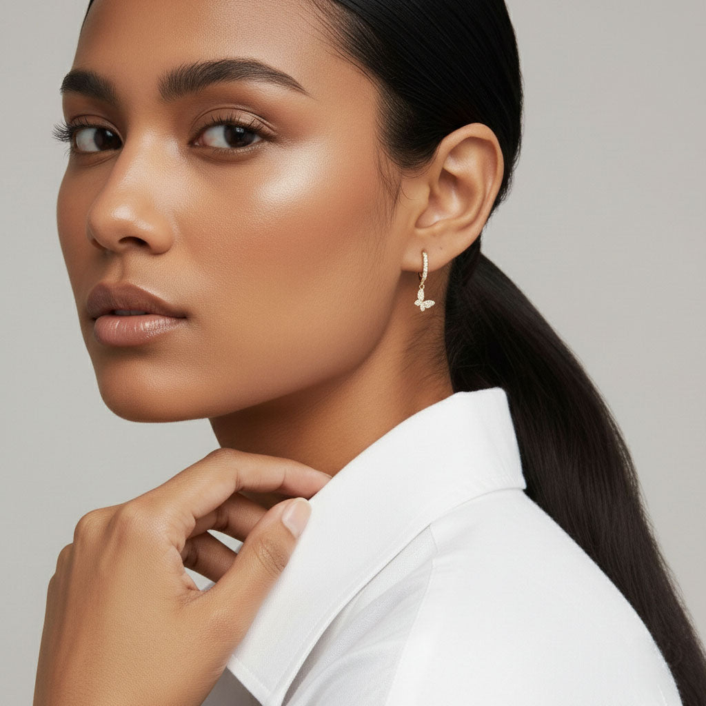 Add a sparkling touch with these hoops featuring small glittering stones and charming butterflies. Perfect for a playful and fun look that brightens your day. Easy to wear and sure to catch some eyes!