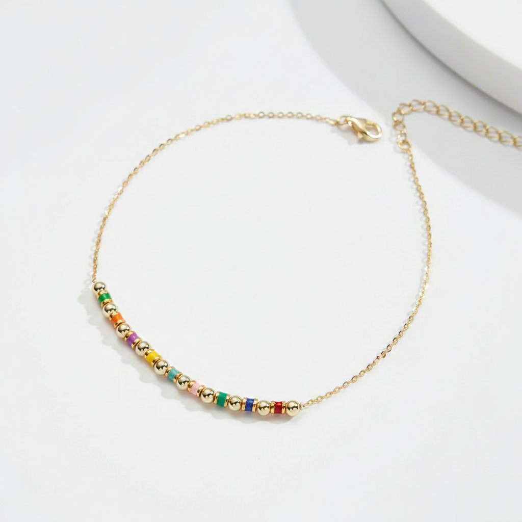 Een prachtig enkelbandje met levendige kleuren, perfect voor zomerse dagen en stranduitstapjes. Stijlvol en comfortabel, goed te combineren met sandalen of casual wandelingen op blote voeten langs het strand.