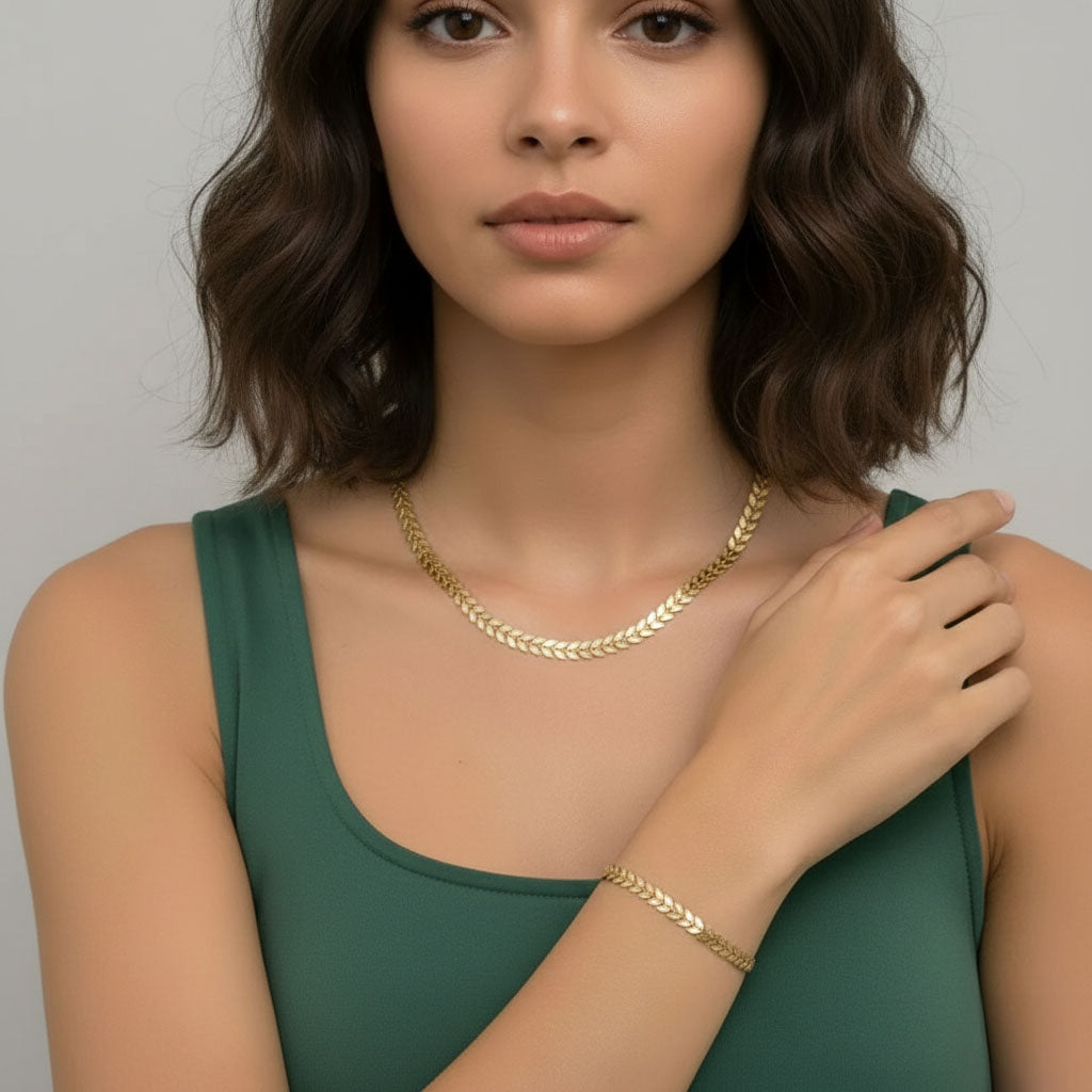 Ontdek onze trendy ketting met een prachtig bladmotief. De fijn gelinkte blaadjes creëren een sierlijk, vloeiend ontwerp rond je hals. Combineer hem met de bijpassende armband en enkelband voor een complete, prachtige look!