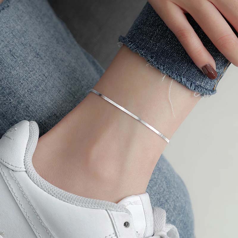 A sterling silver snake chain anklet featuring an elegant and timeless design. It adds a sophisticated, fresh touch to your look and pairs easily with a variety of styles and outfits.