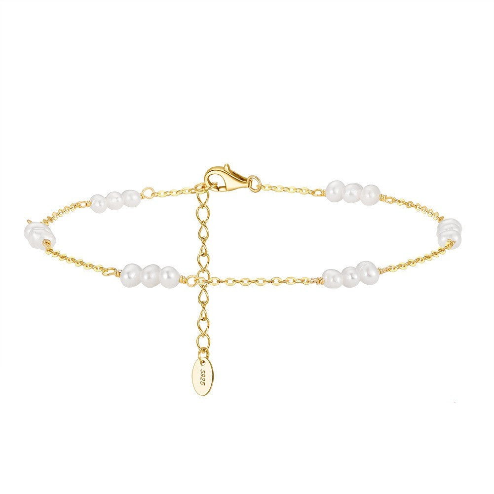 Delicate anklet with a fine 925 sterling silver chain, adorned with small freshwater pearls arranged in groups for a balanced design. Available in silver or gold plating.