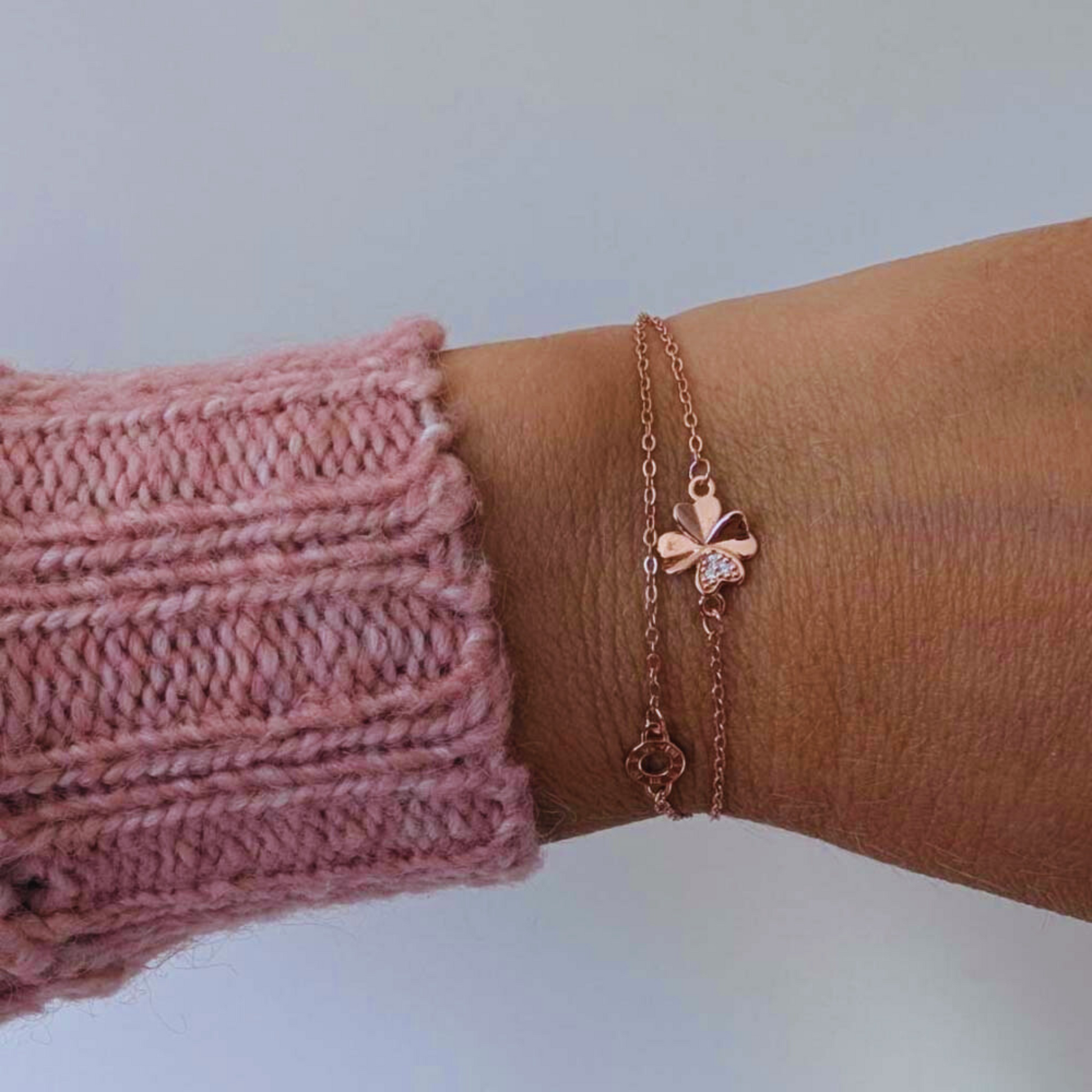 This elegant bracelet features a four-leaf motif symbolising good luck. The double chain adds a refined touch, making it a beautiful accessory that works just as well for relaxed days as for more special moments.
