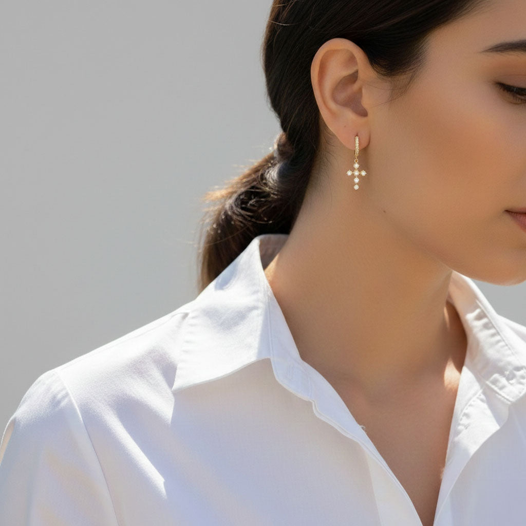 Elegant hoop earrings with a hanging cross that create a bold yet refined expression. The shimmering row of stones catches the light beautifully, adding a touch of luxury. A perfect combination of modern design and timeless symbolism.