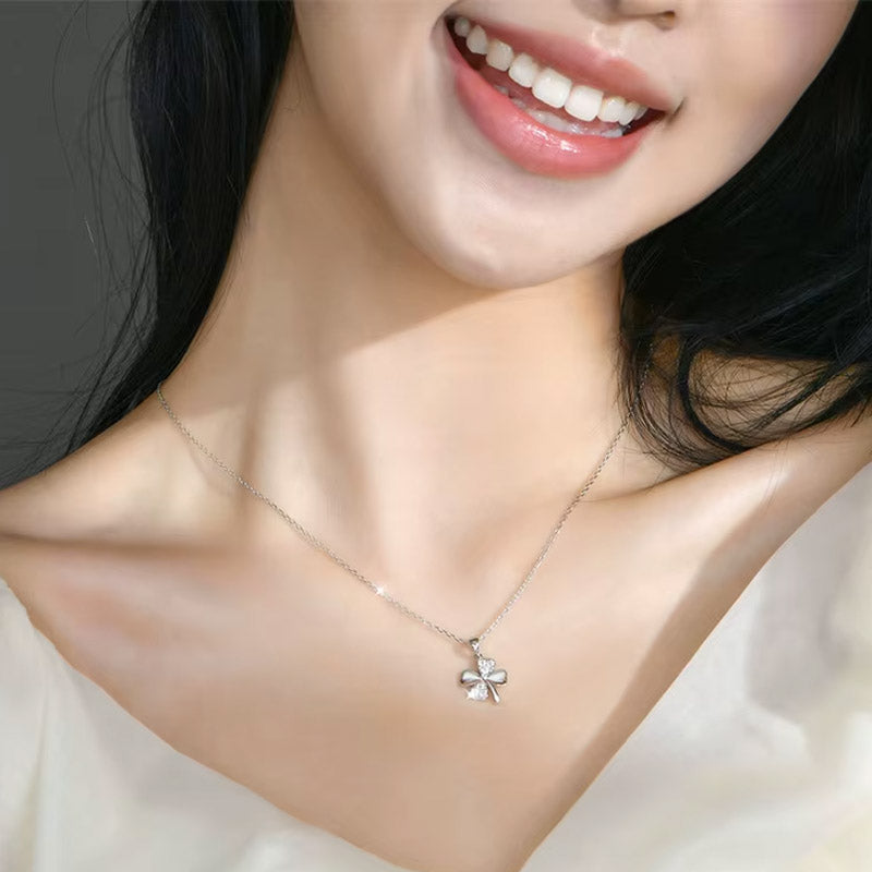 A sleek necklace with a four-leaf clover pendant - a symbol of luck. The pendant features sparkling stones that add subtle shine, contrasting beautifully with the polished leaves.
