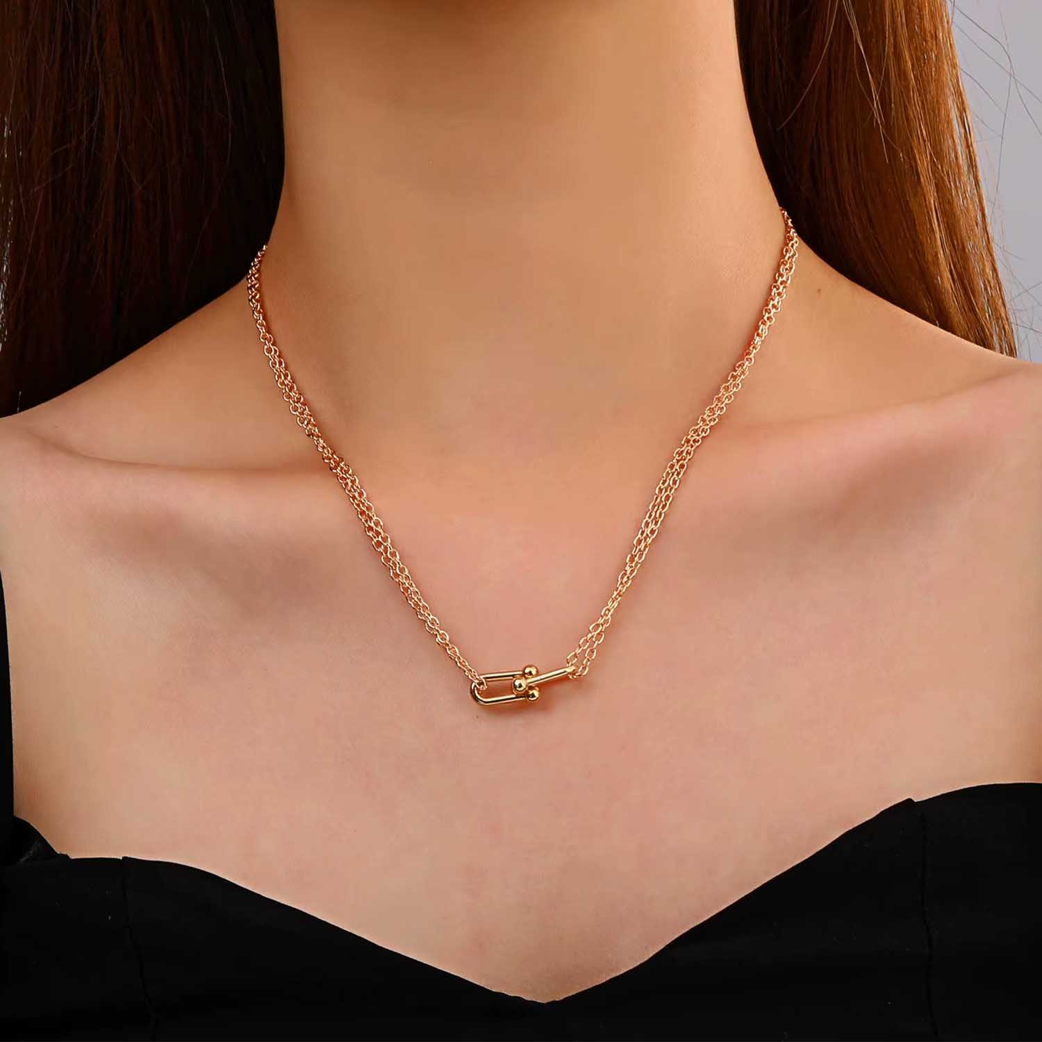 Make a stylish impression with our exclusive necklace featuring a horseshoe pendant and double chains. This modern, elegant design is perfect for those who want to show both style and a touch of luck. Complete the look with matching bracelet and earrings.