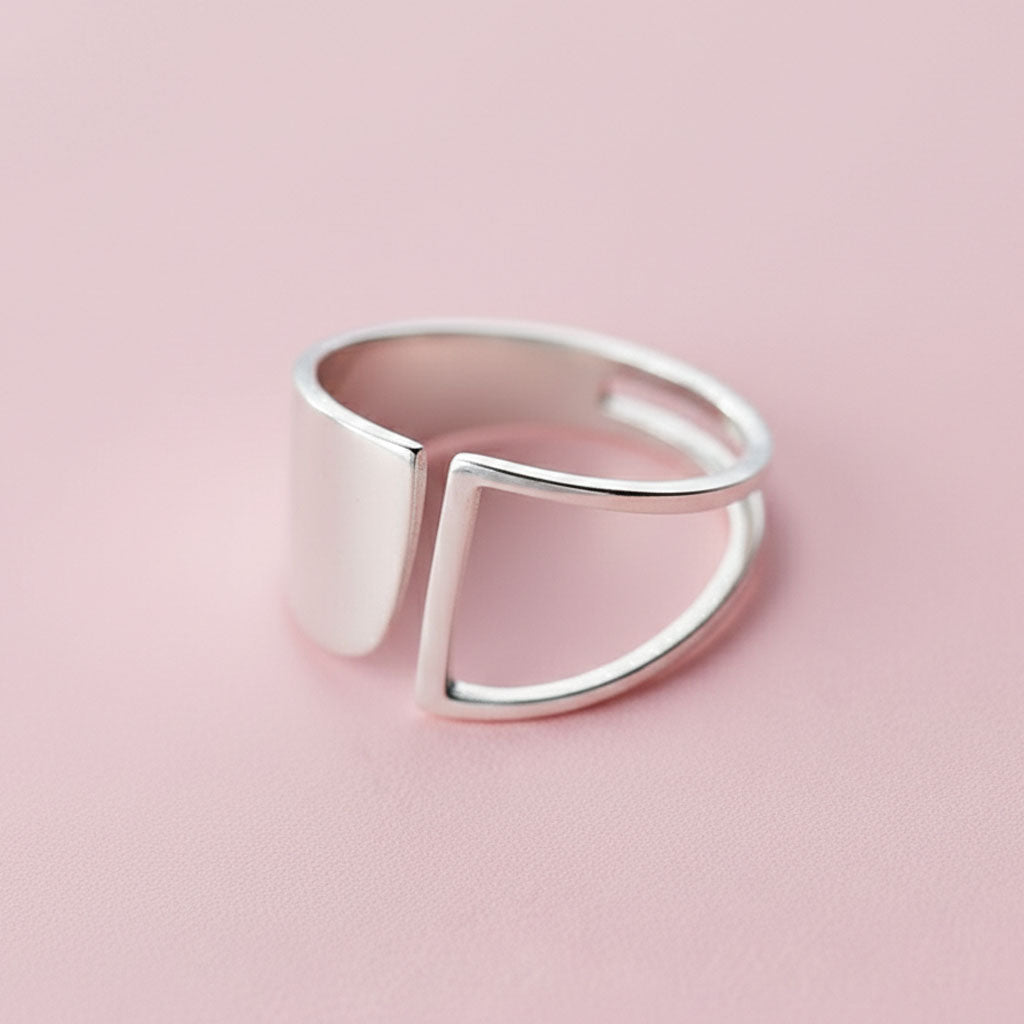 A tasteful sterling silver ring with a modern geometric design. The open shape creates a unique and trendy look that works just as well for everyday wear as when you want to stand out with something special.