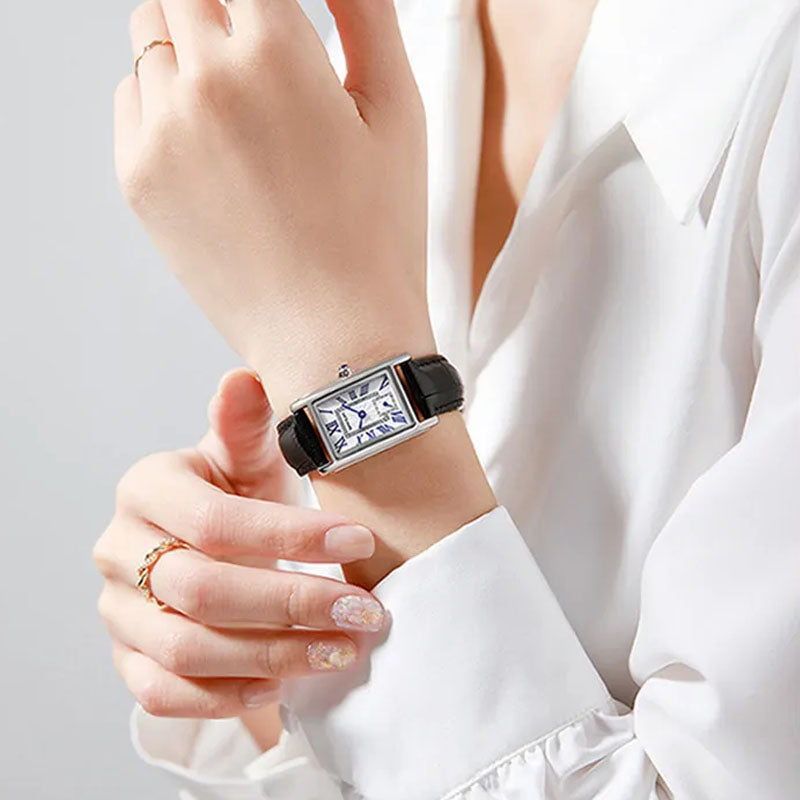 Rectangular women’s watch with a clean, classic dial and subtle lines. A simple yet refined look that’s easy to pair. Available with leather straps in several colors or metal bracelets in silver or gold.